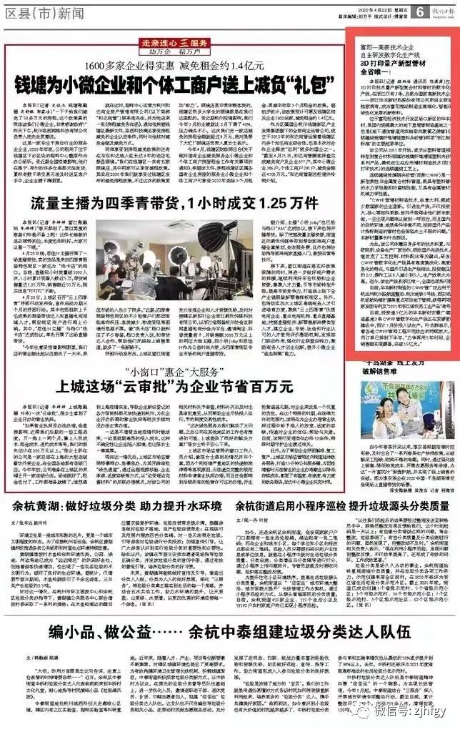 4月22日,杭州日報以“富陽一高新技術企業(yè) 自主研發(fā)數(shù)字化生產(chǎn)線”為題,報道我公司智能化、數(shù)字化、高端化的連續(xù)纏繞玻璃鋼夾砂管(簡稱CWFP)3D打印技術生產(chǎn)線。